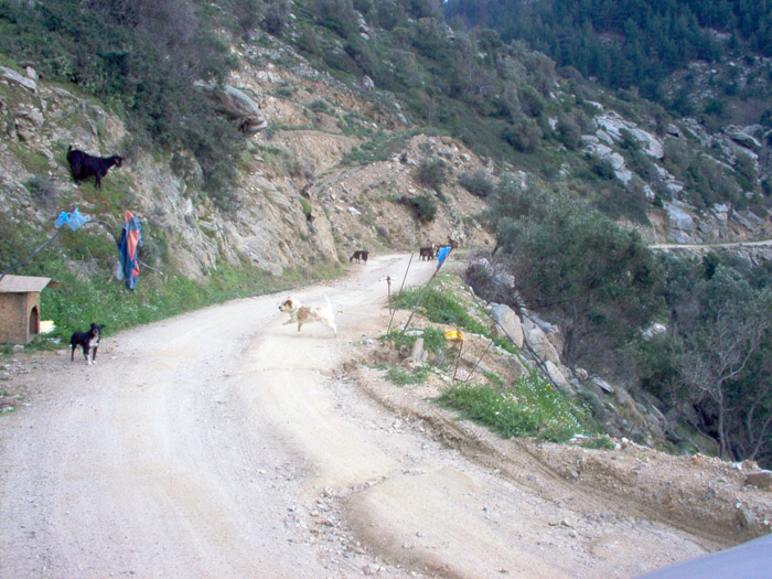 -Τα δυο σκυλιά στην φωτογραφία, δεμένα εκατέρωθεν, κατά πλάτος, της Επαρχιακής οδού στο σημείο που ταυτίζεται με το άνοιγμα που αφήνει σειρά συρματοπλεγμάτων κάθετα στο δρόμο, βρίσκονται εκεί για να αποτρέπουν την πρόσβαση των ζώων σε κατοικημένη περιοχή -οικισμός Να- φανερώνοντας έτσι την πρόθεση «κατοχής» της περιοχής μετά από αυτά, προς και στο φαράγγι. Με το σχοινί του ενός σκυλιού να έχει τόσο μήκος που να καλύπτει όλο το φάρδος του δρόμου, ταυτόχρονα εμποδίζουν μερικώς την διέλευση οχημάτων και ολικώς αυτή των πεζών.