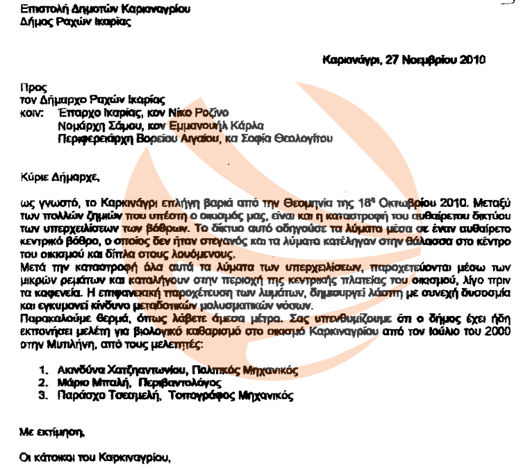 Επιστολή απέστειλαν κάτοικοι του Καρκιναγρίου στο Δήμο Ραχών Ικαρίας, ζητώντας να λυθεί το πρόβλημα των λυμάτων που έχει οξυνθεί μετά την πρόσφατη θεομηνία (Αρ.Πρωτ: 3209 29/11/10). Οι υπογράφοντες (56 στον αριθμό, των οποίων τα ονόματα διαθέτει το ikariamag) τονίζουν πως το αυθαίρετο δίκτυο υπερχειλίσεων των βόθρων έχει καταστραφεί με αποτέλεσμα τα λύματα να καταλήγουν στην πλατεία όπου υπάρχει πια μεγάλη δυσοσμία αλλά και κίνδυνος μολύνσεων, ενώ επισημαίνουν πως υπάρχει από τον Ιούλιο του 2000 μελέτη για βιολογικό καθαρισμό στην περιοχή.