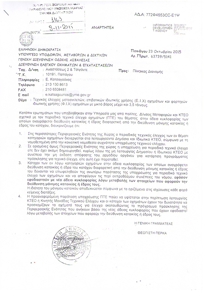 Επειδή πολλά πράγματα λέγονται πολλές φορές μπερδεύοντας τους πολίτες και φυσικά χωρίς να υπάρχει η αντικειμενική ενημέρωση θεωρώ ότι πρέπει να δώσω στη δημοσιότητα το με αρ πρωτ. 63739/5141/23-10-2015 έγγραφο του Υπουργείου Υποδομών, Μεταφορών & Δικτύων. Τονίζοντας εδώ ότι όλα τα οχήματα Δημοσίας Χρήσεως λεωφορεία, ταξί μεταφορικά μέσα που μεταφέρουν μαθητές όλα αυτά υποχρεωτικά πάνε Σάμο και περνάνε ΚΤΕΟ.